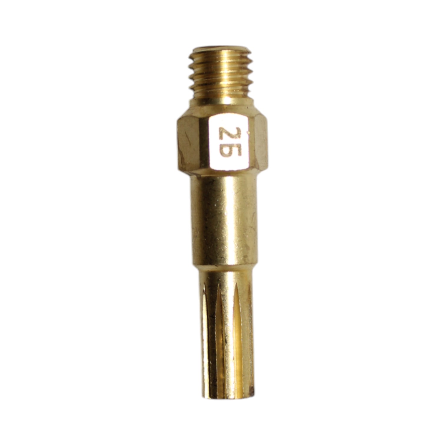 Латунный внутренний мундштук №2Б для жидкотопливного бензинового резака РБ-300. Толщина разрезаемого металла 15–30 мм. Мундштук присоединяется (вкручивается) в головку резака при помощи резьбы М8х1. На цилиндрическую часть мундштука устанавливается диффузор.