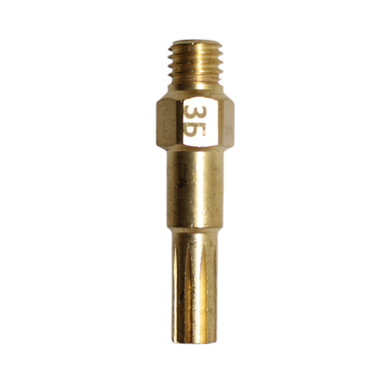 Латунный внутренний мундштук №3Б для жидкотопливного бензинового резака РБ-300. Толщина разрезаемого металла 30–50 мм. Мундштук присоединяется (вкручивается) в головку резака при помощи резьбы М8х1. На цилиндрическую часть мундштука устанавливается диффузор.