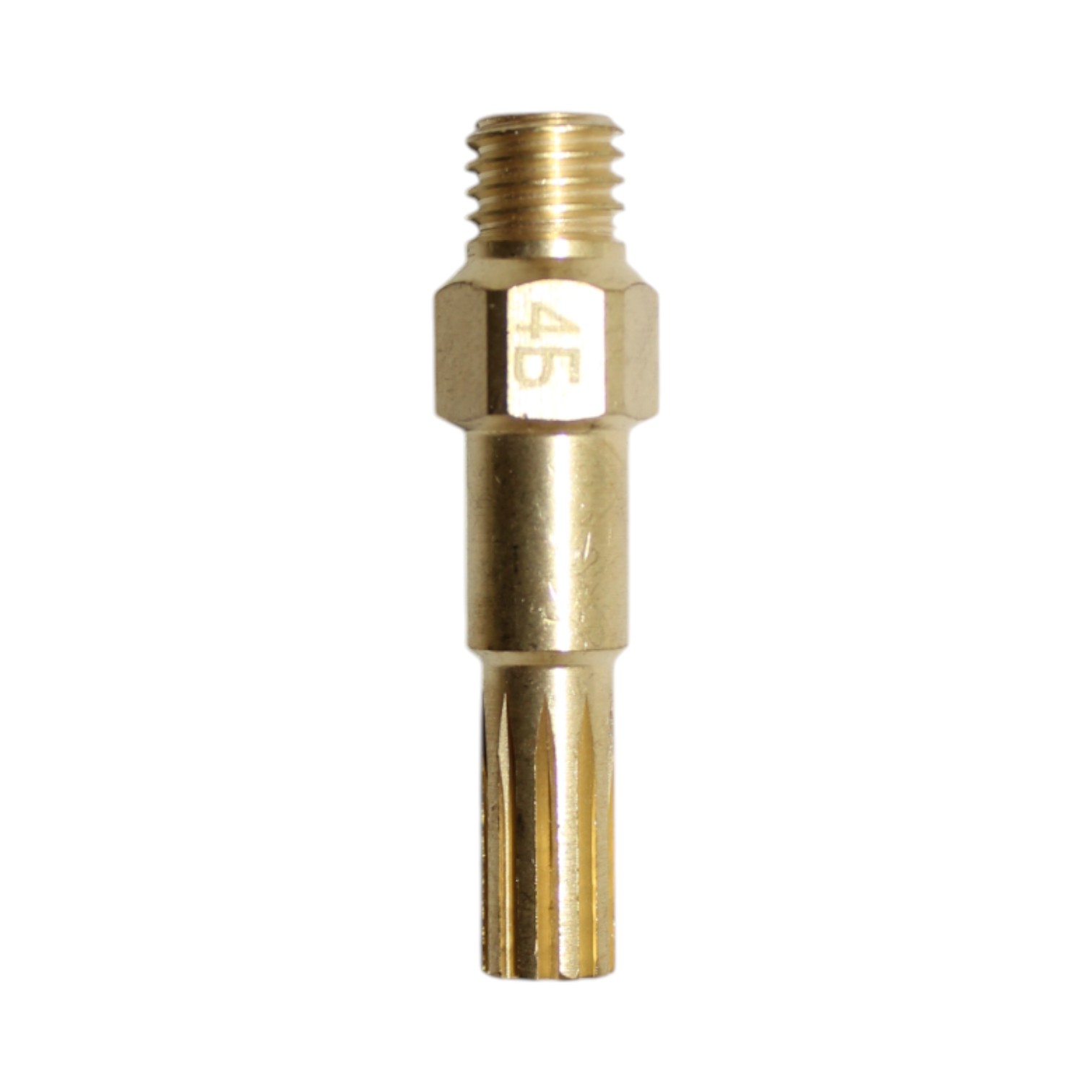 Латунный внутренний мундштук №4Б для жидкотопливного бензинового резака РБ-300. Толщина разрезаемого металла 50–100 мм. Мундштук присоединяется (вкручивается) в головку резака при помощи резьбы М8х1. На цилиндрическую часть мундштука устанавливается диффузор.