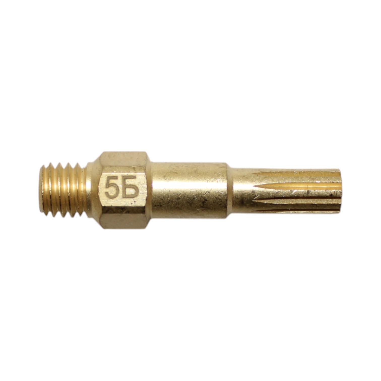 Латунный внутренний мундштук №5Б для жидкотопливного бензинового резака РБ-300. Толщина разрезаемого металла 100–200 мм. Мундштук присоединяется (вкручивается) в головку резака при помощи резьбы М8х1. На цилиндрическую часть мундштука устанавливается диффузор.