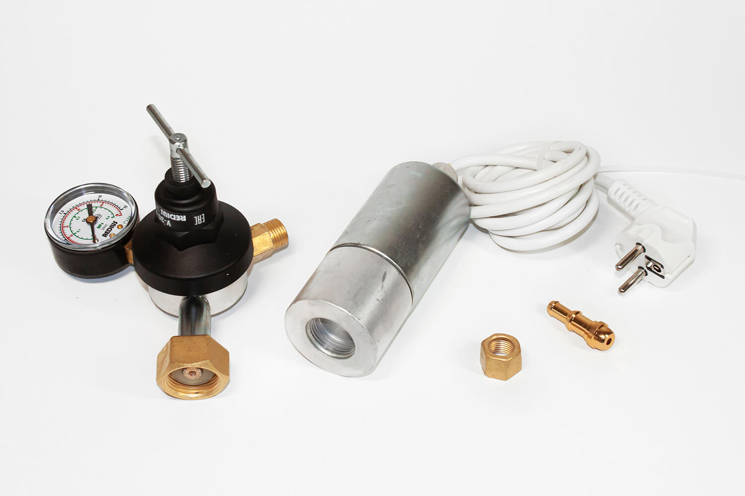 Регулятор расхода баллонный одноступенчатый предназначен для понижения и регулирования давления углекислого газа, поступающего из баллона, и автоматического поддержания постоянного рабочего расхода газа на выходе регулятора в ходе проведения работ. Подогреватель используется для предотвращения замерзания механизмов редуктора при больших расходах газа или при низких температурах окружающей среды. Подогрев осуществляется за счет теплообмена между газом и горячими стенками корпуса подогревателя.